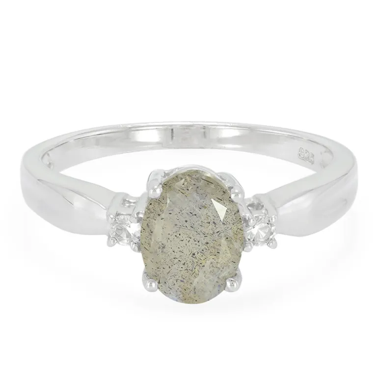 Entdecken Sie die faszinierende Schönheit dieses atemberaubenden Rings, der einen Labradorit von 0,93 Karat im Ovalschliff von den malerischen Küsten Madagaskars zeigt. Flankiert von zwei brillanten Topasen von 0,069 Karat aus Brasilien, strahlt dieses Stück aus Sterlingsilber Eleganz aus. Die Harmonie zwischen dem schillernden Labradorit und dem funkelnden Topas macht ihn zu einer vielseitigen Ergänzung für jede Schmucksammlung. Sein bezauberndes Farbenspiel passt sowohl zu Freizeit- als auch zu Abendgarderobe und ist damit eine ideale Wahl für verschiedene Anlässe.