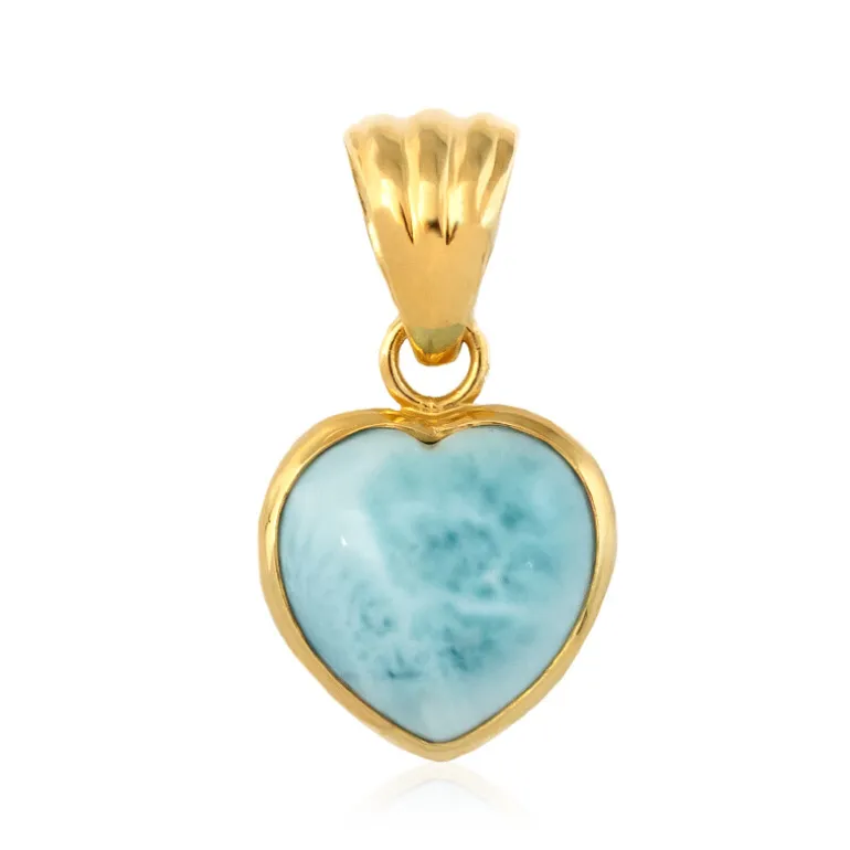 Dieser bezaubernde, herzförmige Anhänger besteht aus einem 9,4-karätigen Larimar, der für seine beruhigenden, meerblauen Farbtöne bekannt ist. Er ist elegant in 925er Sterlingsilber mit einer glänzenden Goldplattierung gefasst. Der aus der Dominikanischen Republik stammende Edelstein wurde in einen glatten Cabochon geschliffen, der seine natürlichen Muster, die an die karibischen Gewässer erinnern, hervorhebt. Er eignet sich perfekt, um jedem Outfit einen Hauch von Liebe zu verleihen, und ist ideal für Jahrestage, Verlobungen oder als Geschenk mit Herz. Der Anhänger misst 25×15 mm und wiegt 2,5 g, was seine auffällige Schönheit mit einem angenehmen Tragekomfort in Einklang bringt.
