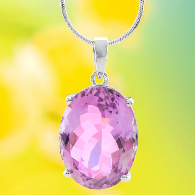 Entdecken Sie die heitere Eleganz unseres brasilianischen Lavendel-Amethyst-Anhängers. Eingebettet in hochwertiges platiniertes 925er Sterling Silber, präsentiert sich dieser exquisite 15,48 Karat schwere Edelstein im klassischen Ovalschliff mit einer Größe von ca. 20×15 mm. Der zarte violette Farbton des Anhängers macht ihn zu einem vielseitigen Accessoire, das sowohl tagsüber charmant als auch abends raffiniert ist. Er ist ein Statement-Stück, das ein legeres Ensemble aufwertet oder einer formellen Kleidung einen Hauch von Anmut verleiht.