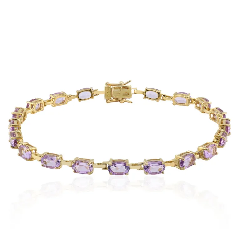 Dieses exquisite Armband besteht aus 20 lavendelfarbenen Amethysten aus Brasilien, jeder in einem eleganten Ovalschliff, mit insgesamt 7,128 Karat. Das Stück aus 925er Sterlingsilber mit luxuriöser Goldplattierung wiegt etwa 4,8 Gramm und ist 19,5 cm lang. Es ist ein vielseitiges Accessoire für jede Schmucksammlung und eignet sich sowohl für legere als auch für formelle Anlässe.