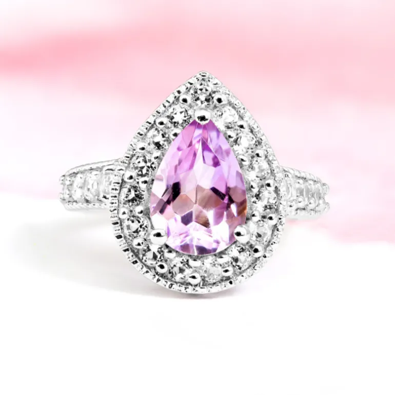 Entdecken Sie die schlichte Eleganz unseres brasilianischen Lavendel-Amethyst-Rings, der mit einem 1,4 Karat schweren, birnenförmigen Amethyst in der Mitte besticht. Flankiert von einem Ensemble funkelnder weißer Topase von insgesamt über 0,9 Karat aus Indien, ist dieses atemberaubende Stück in hochwertigem 925er Sterlingsilber mit poliertem Finish gefasst. Mit einer Ringfläche von 24 x 21 mm ist er ein bedeutendes Schmuckstück, das sowohl im Alltag als auch zu besonderen Anlässen getragen werden kann. Kombinieren Sie ihn mit Pastellfarben, um die sanften violetten Töne hervorzuheben, oder kontrastieren Sie ihn mit dunkleren Tönen, um einen Farbakzent zu setzen.