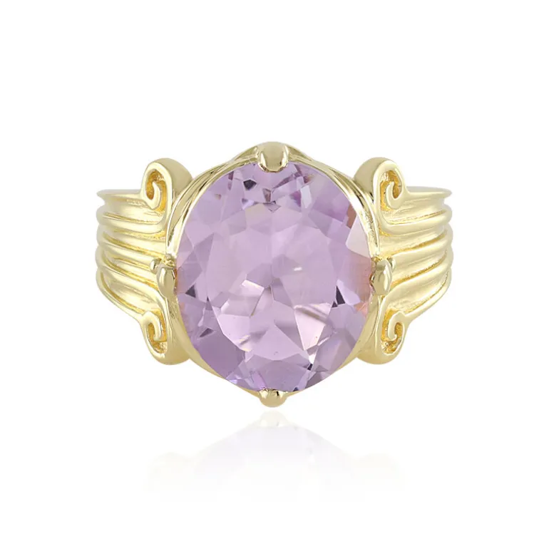 Entdecken Sie den heiteren Charme dieses brasilianischen Lavendel-Amethyst-Rings mit einem ovalen Edelstein von 3,838 Karat und einem glänzenden Band aus vergoldetem 925er Sterlingsilber. Der oval geschliffene Amethyst mit einer Größe von ca. 12×10 mm ist in einem exquisiten Design gefasst, das Eleganz und Raffinesse widerspiegelt. Dieser Ring ist perfekt, um jedem Ensemble einen Hauch von königlichem Glanz zu verleihen, und eignet sich sowohl für zwanglose Brunches als auch für formelle Abende. Sein bezaubernder Farbton und seine anmutige Fassung werden Amethyst-Liebhaber und Modefans gleichermaßen verzaubern.