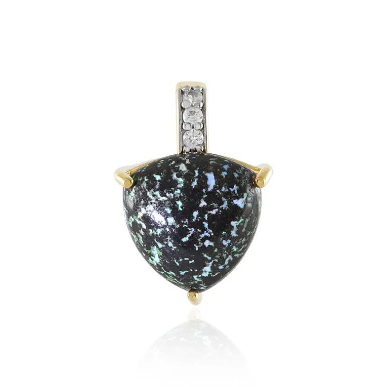 Entdecken Sie die bezaubernde Schönheit dieses exotischen Anhängers, der einen prächtigen 4,636ct Leoparden-Opal aus Mexiko präsentiert. Der Opal im Trilliant-Cabochon-Schliff mit einer Größe von ca. 14 mm bietet ein atemberaubendes Schauspiel an schillernden Farben. Begleitet von drei funkelnden Zirkonen im Rundschliff mit einem Gesamtgewicht von 0,137 ct, verkörpert dieses Stück die wilde Eleganz der Natur. Gefasst in 925er Sterlingsilber mit einer glänzenden Goldauflage, strahlt dieser Anhänger einen schicken und zeitlosen Charme aus. Er ist eine vielseitige Ergänzung für jede Schmucksammlung und eignet sich perfekt, um ein legeres Ensemble aufzuwerten oder der Abendgarderobe einen besonderen Touch zu verleihen.