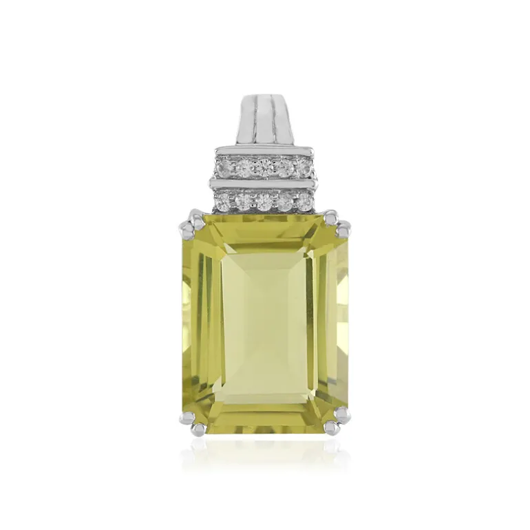 Beleuchten Sie Ihren Stil mit diesem strahlenden Anhänger aus brasilianischem Zitronenquarz, der von funkelnden Zirkonen aus Kambodscha ergänzt wird. Der achteckige, stufenförmig geschliffene Stein des Anhängers aus platiniertem 925er Sterling Silber glänzt in einem leuchtenden Zitruston und wiegt beeindruckende 8,943 Karat. Das schlanke Design wird durch einen Halo aus Zirkonen im Rundschliff akzentuiert, der einen subtilen Schimmer verleiht. Dieses Schmuckstück ist ein elegantes Accessoire, das sowohl zum legeren Brunch als auch zu formellen Abendveranstaltungen passt und jedes Outfit aufwertet.