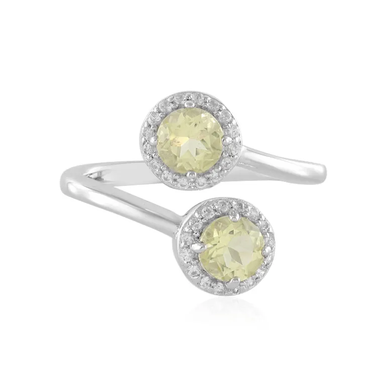 Dieser stilvolle Ring besteht aus zwei strahlenden Zitronenquarz-Edelsteinen aus Brasilien, die auf einem eleganten 925er Sterlingsilberband gefasst sind. Jeder der meisterhaft rund geschliffenen Quarze wird von einem Halo aus funkelnden kambodschanischen Zirkonen ergänzt, die zusammen ein Gesamtkaratgewicht von 0,922 ct ergeben. Mit einer Größe von 22×20 mm ist dieses Schmuckstück perfekt geeignet, um jedem Outfit einen Hauch von Raffinesse und einen Hauch von erfrischender Zitronenfarbe zu verleihen. Er ist ideal für den Tag oder die Nacht und schlägt die Brücke zwischen modernem Stil und zeitloser Eleganz.