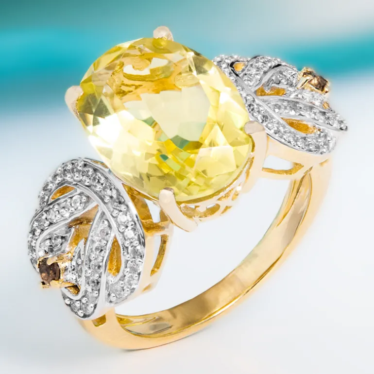 Schmücken Sie Ihren Finger mit den leuchtenden Sonnenfarben dieses Rings aus brasilianischem Zitronenquarz, der von glitzernden Zirkon-Highlights ergänzt wird. Eingefasst in ein glänzend vergoldetes 925er Sterling Silberband, steht das Kunstwerk der Natur mit einem 5,4-karätigen Zitronenquarz im klassischen Ovalschliff im Mittelpunkt. Flankiert von dezentem Rauchquarz und umgeben von 62 kambodschanischen Zirkonen, ist dieses Schmuckstück nicht nur ein Schmuckstück, sondern auch ein Gesprächsanlass. Perfekt, um einem eintönigen Outfit einen Farbtupfer zu verleihen oder als Herzstück Ihres Ensembles für eine Sommergartenparty.