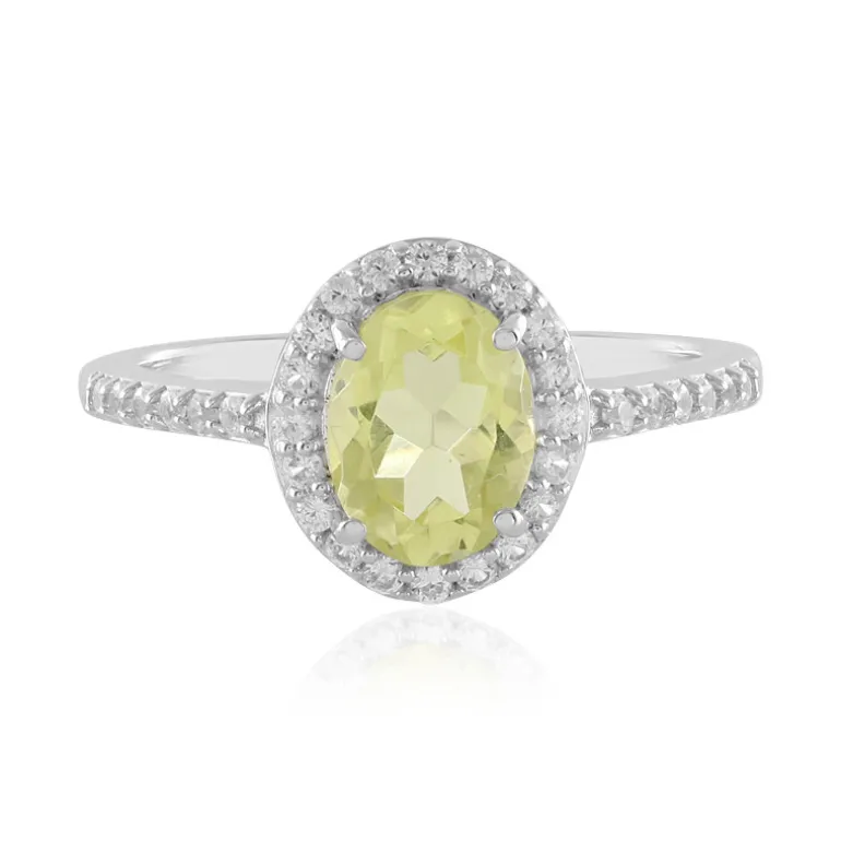 Dieser bezaubernde Ring präsentiert einen leuchtenden brasilianischen Zitronenquarz von 1,125 Karat im Ovalschliff, gefasst in hochwertigem 925er Sterlingsilber. Eingerahmt von einem Halo aus funkelnden Zirkonen im Rundschliff von insgesamt 0,374 ct aus Kambodscha, zieht der hellgrüne Edelstein mit seinem einzigartigen, frischen Farbton die Aufmerksamkeit auf sich. Sein klassisches und zugleich modernes Design macht ihn zu einem idealen Accessoire für legere und formelle Anlässe, das perfekt zu einem Sommerkleid passt oder ein Business-Ensemble aufwertet.