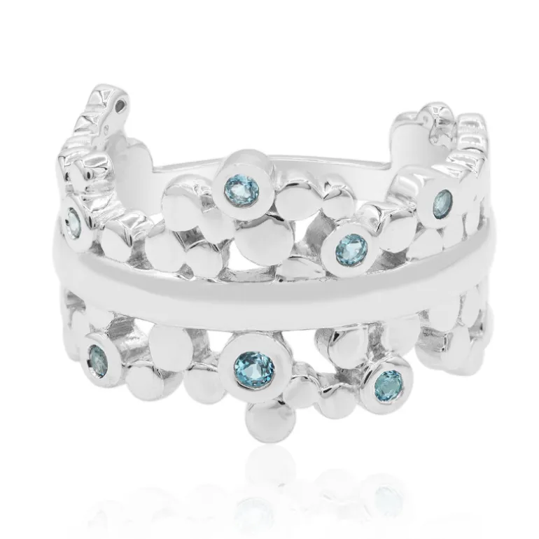 Tauchen Sie ein in den kühlen Glanz dieses Rings aus Sterlingsilber, gekrönt von faszinierenden blauen Londoner Topasen aus Brasilien. Jeder Edelstein, der im Präzisionsschliff geschliffen wurde, um zu funkeln, ist sorgfältig in ein verspieltes Arrangement eingefasst, das an skurrilen Meeresschaum erinnert. Das fein gearbeitete Band aus 925er Sterlingsilber mit einem Gewicht von 5,44 Gramm Edelmetall garantiert Langlebigkeit und Stil. Perfekt, um einem legeren Ensemble einen Farbtupfer zu verleihen oder als Statement-Stück für abendliche Anlässe.