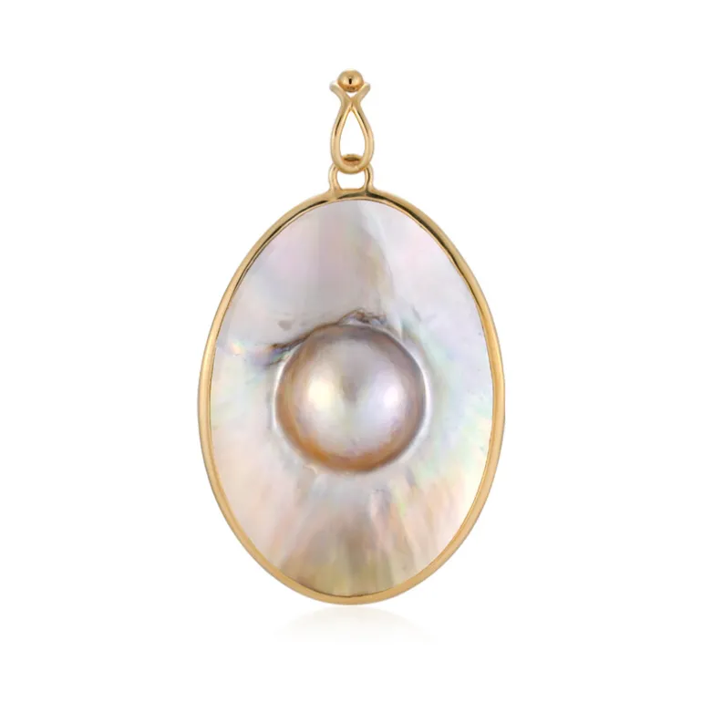 Entdecken Sie die bezaubernde Anziehungskraft dieses vom Balinesen inspirierten Anhängers mit einer schimmernden indonesischen Mabe-Perle in einer eleganten Fassung aus vergoldetem 925er Sterlingsilber. Die ovale Form hebt den natürlichen Glanz und die Tiefe der Perle hervor und macht diesen 56×36 mm großen Anhänger zu einer bezaubernden Ergänzung für jedes Ensemble. Sein vielseitiges Design eignet sich perfekt für verschiedene Anlässe, von formellen Veranstaltungen bis hin zu zwanglosen Zusammenkünften, und passt wunderbar zu hochgeschlossenen Blusen und Kleidern mit offenem Ausschnitt.