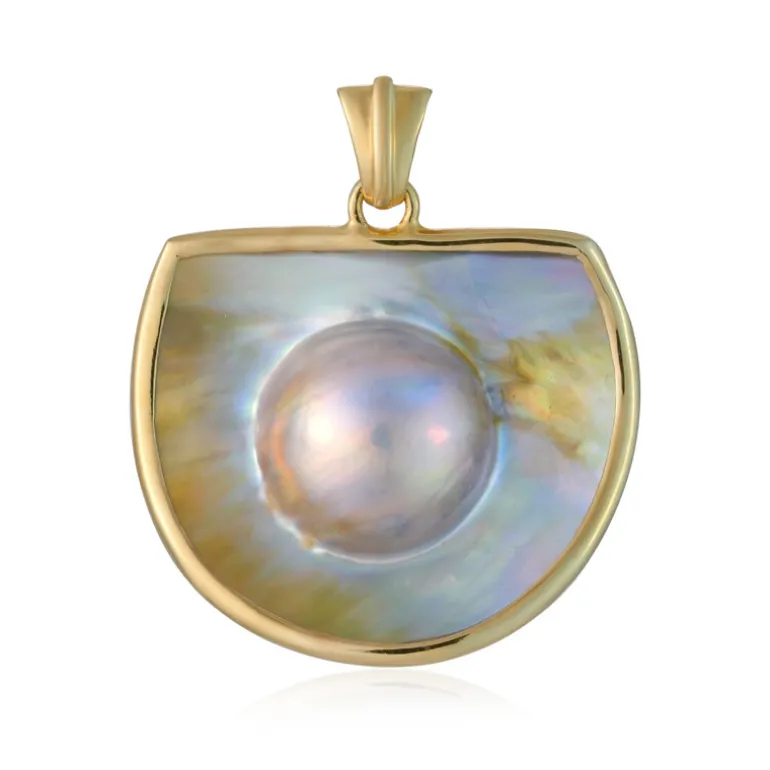 Entdecken Sie die Faszination indonesischer Handwerkskunst mit diesem exquisiten Anhänger mit einer atemberaubenden Mabe-Perle, die in 925er Sterlingsilber mit einer eleganten Goldplattierung gefasst ist. Die ausgefallene Form der Perle, die etwa 27×25 mm misst, reflektiert eine schillernde Palette von Farben und verkörpert die Essenz von Balis mystischem Barong. Dieser Anhänger mit einem Gewicht von ca. 1,9 Gramm ist eine schicke Ergänzung zu jedem Outfit und lässt sich nahtlos von der Tages- in die Abendgarderobe überführen. Perfekt für alle, die die Verschmelzung von kulturellem Erbe und modernem Design zu schätzen wissen.