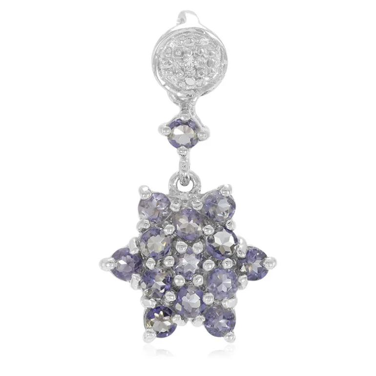Entdecken Sie die Faszination Madagaskars mit diesem atemberaubenden Anhänger, der eine Gruppe von 14 Iolithen im Rundschliff mit insgesamt 0,77 Karat enthält. Der Anhänger ist in hochwertigem 925er Sterlingsilber gefasst und wird von einem brasilianischen weißen Topas akzentuiert, der einen Hauch von Brillanz verleiht. Er ist eine vielseitige Ergänzung für jede Kollektion und eignet sich sowohl für ein legeres Outfit als auch für eine glanzvolle Abendgarderobe. Sein Design strahlt einen raffinierten Charme aus, der bei jeder Veranstaltung die Aufmerksamkeit auf sich zieht.