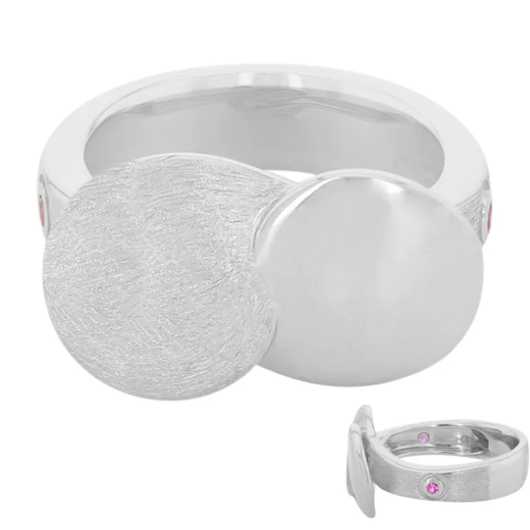 Ein Hauch von minimalistischem Charme mit unserem 925er Silberring mit Madagaskar-Rubinbesatz. Dieses elegante Schmuckstück besticht durch zwei rund geschliffene Madagaskar-Rubine von insgesamt 0,036 Karat, die sich dezent in den polierten Glanz von feinem Sterlingsilber schmiegen. Das ausgewogene kreisförmige Motiv und die gebürstete Textur verleihen dem klassischen Stil eine moderne Note. Dieser Ring eignet sich perfekt, um einem raffinierten Büro-Outfit einen farbigen Akzent zu verleihen, oder als schicke Ergänzung zu Ihrer Abendgarderobe. Er ist ein unaufdringliches, aber fesselndes Accessoire für jede Gelegenheit.