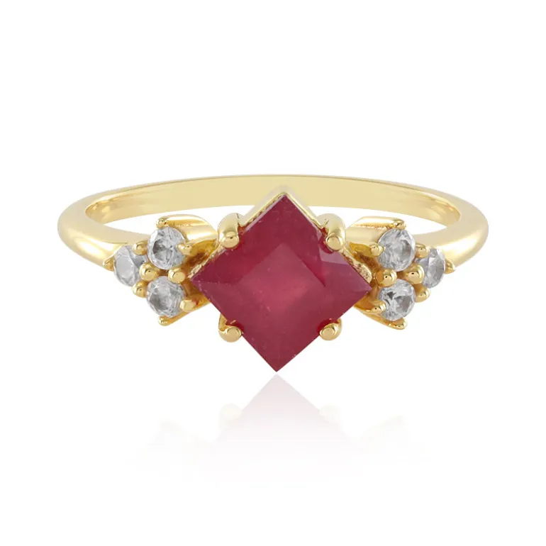 Lassen Sie sich von diesem atemberaubenden Ring mit einem Madagaskar-Rubin verführen. Der zentrale Edelstein im Quadratschliff wird von sechs runden Zirkonen aus Kambodscha ergänzt. Die Vergoldung des 925er Sterlingsilbers verleiht ihm einen luxuriösen Glanz, der die Attraktivität des Rings insgesamt erhöht. Sein elegantes Design und das Gesamtgewicht von 1,744 Karat machen ihn zu einer perfekten Wahl für besondere Anlässe oder den Alltag. Kombinieren Sie ihn mit einem eleganten Abendkleid oder einem raffinierten Arbeitsoutfit, um Ihrem Ensemble einen Hauch von Klasse zu verleihen.