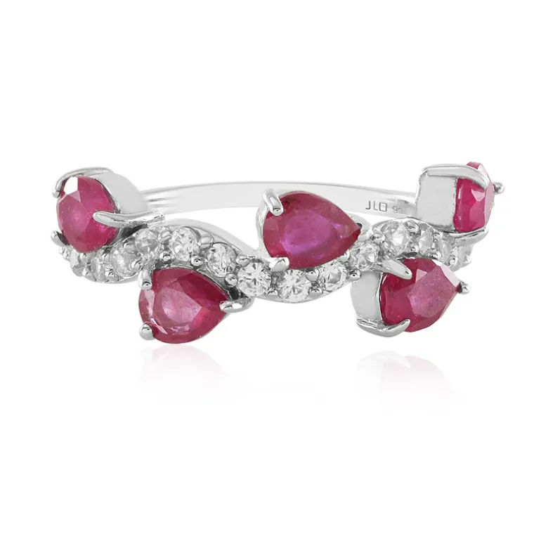 Entdecken Sie die Anziehungskraft unseres Silberrings mit Madagaskar-Rubin, der mit fünf Rubinen im Tropfenschliff mit einem Gesamtgewicht von 1,963 ct und 17 funkelnden Zirkonen im Rundschliff aus Kambodscha mit einem Gesamtgewicht von 0,534 ct besetzt ist. Der Ring ist aus platiniertem 925er Sterlingsilber gefertigt, wiegt etwa 2,4 Gramm und hat ein Gesamtkaratgewicht von 2,497 ct. Die Abmessungen des Rings betragen 23 x 21 mm und verleihen ihm eine ausgewogene Eleganz. Dieses Schmuckstück eignet sich perfekt für besondere Anlässe oder als Farbtupfer im Alltag und sorgt für Gesprächsstoff.