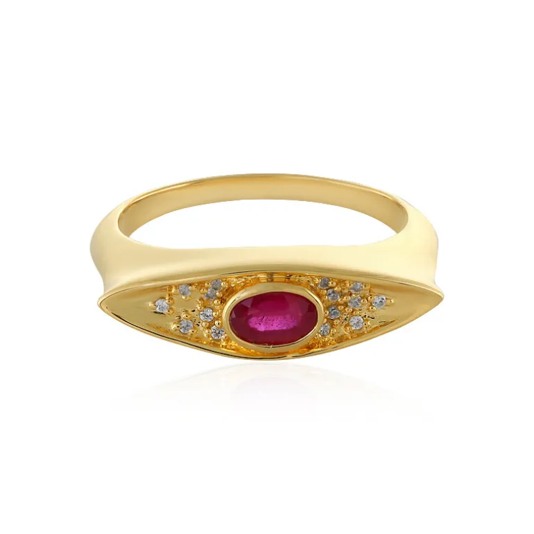 Dieser exquisite Ring aus vergoldetem 925er Sterlingsilber ist mit einem leuchtenden Madagaskar-Rubin von 0,629 Karat im Ovalschliff besetzt und strahlt Raffinesse aus. Er ist mit einem Halo aus 15 funkelnden kambodschanischen Zirkonen von insgesamt 0,1 Karat besetzt, die einen schillernden Kontrast zum satten Farbton des Rubins bilden. Sein schlankes Design bringt die Schönheit des Edelsteins wunderbar zur Geltung und macht ihn zu einem idealen Accessoire sowohl für Verlobungen am Tag als auch für Galas am Abend. Das Gewicht des Rings von ca. 7,24 g sorgt für einen angenehmen Tragekomfort. Kombinieren Sie dieses Schmuckstück mit Ihrem Lieblingskleid, um jedem Anlass einen Hauch von Eleganz zu verleihen.