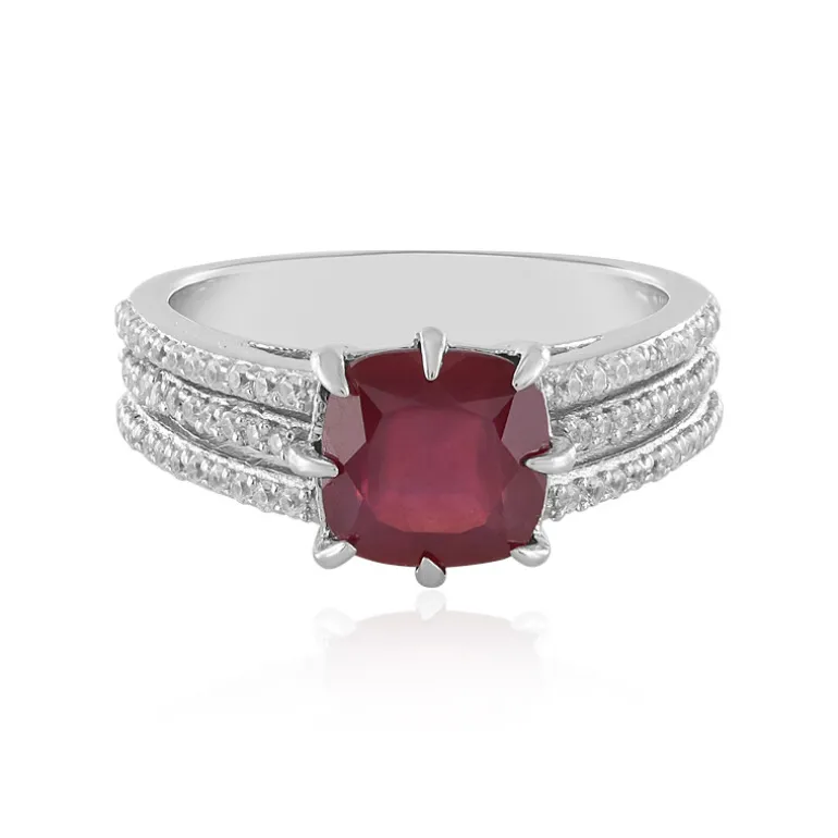Entdecken Sie die Anziehungskraft dieses Schatzes aus Sterlingsilber mit einem majestätischen 3,233-karätigen Madagaskar-Rubin im antiken Kissenschliff, umgeben vom subtilen Funkeln von 64 kambodschanischen Zirkonen von insgesamt 0,612 Karat. Der mit glänzendem Platin überzogene Ring wiegt etwa 3,74 g und hat ein Gesamtkaratgewicht von 3,845 ct. Sein satter, tiefroter Farbton eignet sich perfekt, um jedem Ensemble einen Hauch von zeitloser Raffinesse zu verleihen, während das Design mit mehreren Bändern seinen klassischen Charme noch verstärkt. Ideal für besondere Anlässe oder als eleganter Begleiter für den Alltag.