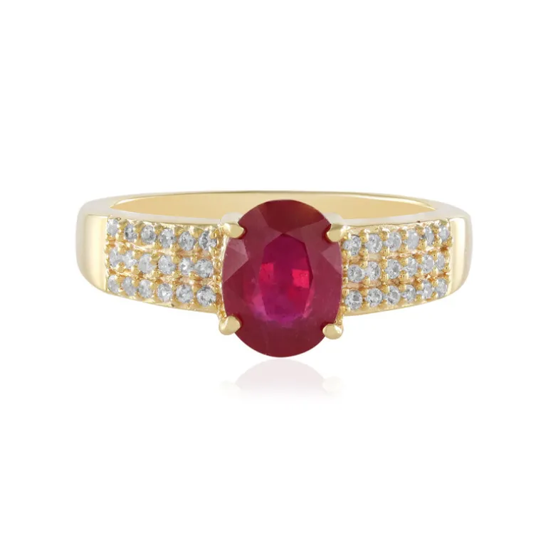 Entdecken Sie die Faszination dieses exquisiten Rings mit einem ovalen Rubin aus Madagaskar von 1,365 Karat, umgeben von kambodschanischen Zirkonen. Der Ring ist aus 925er Sterlingsilber gefertigt und schimmert mit einer Goldplattierung. Er hat ein Gesamtkaratgewicht von 1,604 Karat. Perfekt für elegante Abende oder um Ihrem Alltagslook einen Hauch von Raffinesse zu verleihen. Kombinieren Sie ihn mit passenden goldenen Accessoires für einen stimmigen Stil.