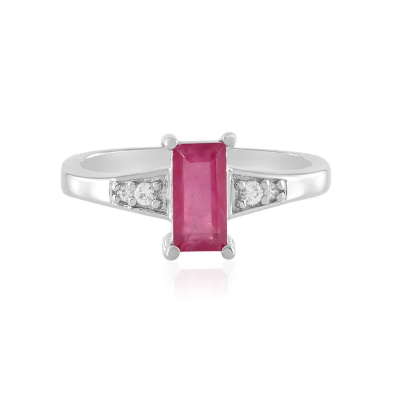 Entdecken Sie die Eleganz dieses Rings mit Madagaskar-Rubin, der einen Rubin im Baguetteschliff von 1,195 Karat mit Zirkonen aus Kambodscha kombiniert. Der Ring ist aus 925er Sterlingsilber mit Platinbeschichtung gefertigt und strahlt Raffinesse und zeitlosen Stil aus. Perfekt für einen Abend oder formelle Anlässe, passt dieses Schmuckstück sowohl zu modernen als auch zu klassischen Outfits und verleiht jedem Ensemble einen Hauch von Glamour.