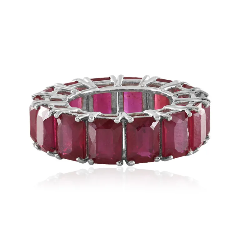 Dieser verführerische Silberring zeigt einen vollen Kreis aus leuchtenden Madagaskar-Rubinen und ist ein auffälliger Blickfang. Mit seinem überschwänglichen roten Farbton strahlt der Ring einen warmen, lebendigen Charme aus, der zu jedem Anlass passt. Das robuste Design umschließt die Edelsteine sicher und lässt sie bei Bewegung funkeln. Er ist eine ausgezeichnete Wahl, um der Abendgarderobe einen Hauch von Glamour zu verleihen oder tagsüber einen Farbakzent zu setzen. Kombinieren Sie sie mit Ihrem Lieblingskleid oder Ihrer Lieblingsbluse für einen mühelos eleganten Look.