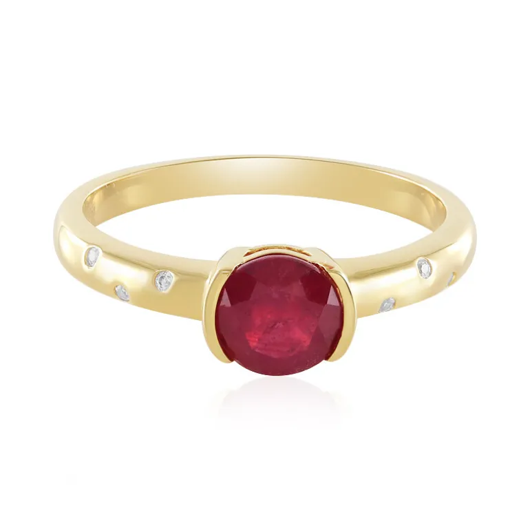Entdecken Sie die Anziehungskraft dieses bezaubernden Rings aus vergoldetem 925er Sterling Silber, dessen Herzstück ein glänzender Madagaskar-Rubin von 1,795 Karat im Rundschliff ist. Akzentuiert durch sechs kambodschanische Zirkone von insgesamt 0,071 Karat, kombiniert dieses Stück klassische Raffinesse mit einem Hauch von modernem Glanz. Mit einem Gewicht von ca. 2,61 g strahlt dieser Ring Eleganz aus und ist eine vielseitige Wahl sowohl für den Alltag als auch für besondere Anlässe. Kombinieren Sie ihn mühelos mit Ihrer Lieblingskleidung für einen sofortigen Hauch von Luxus.