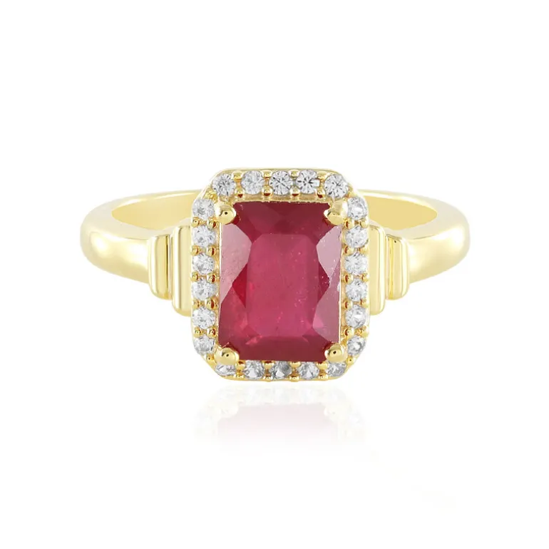 Entdecken Sie die Anziehungskraft dieses atemberaubenden Rings aus vergoldetem 925er Sterlingsilber, gekrönt von einem prächtigen Madagaskar-Rubin im Oktagon-Schliff von 2,055 cm Größe (ca. 8 x 6 mm). Umgeben von einem bezaubernden Cluster aus 22 kambodschanischen Zirkonen im Präzisionsschliff mit einem Gesamtgewicht von 0,261 ct, ist dieses exquisite Stück ein Zeugnis der Eleganz. Mit einem Gewicht von ca. 2,81 g ist er eine zeitlose Ergänzung für jede Sammlung und perfekt geeignet, um Ihrer Abendgarderobe einen Hauch von anspruchsvollem Glamour zu verleihen.