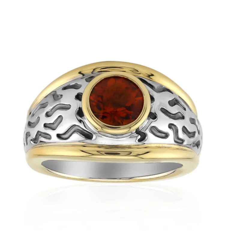 Lassen Sie sich von der warmen Anziehungskraft dieses auffälligen brasilianischen Madeira-Citrinrings verzaubern. Das Herzstück ist ein lebendiger 0,51 Karat großer Edelstein im Rundschliff, gefasst in glänzendem 925er Sterlingsilber mit einem interessanten, strukturierten Muster, akzentuiert durch einen kleinen tansanischen Zirkon. Dieses erhabene Schmuckstück ist ein Zeugnis für Handwerkskunst und Eleganz. Das zweifarbige Design mit Goldplattierung verleiht Ihrer Garderobe einen modernen Twist und macht ihn zu einem Blickfang bei jeder Abendveranstaltung oder zu einem luxuriösen Accessoire für jeden Tag.