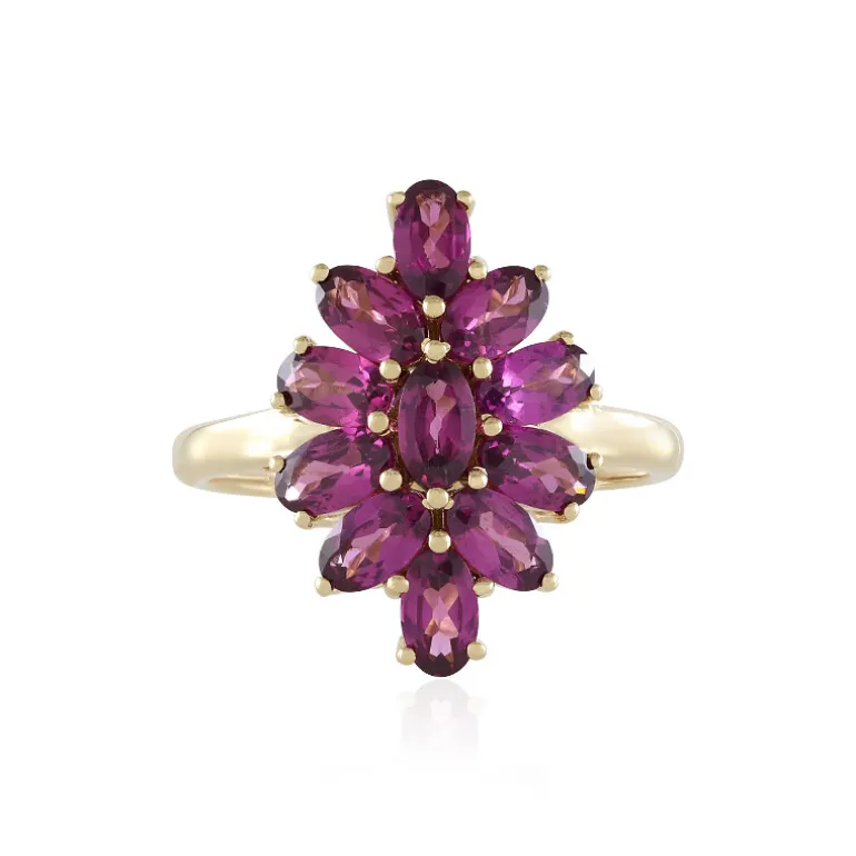 Dieser exquisite Ring besteht aus 11 leuchtenden magentafarbenen Granaten aus Mosambik, die zart in einem ovalen Schliff angeordnet sind. Der Ring ist in 9-karätigem Gold gefasst und bietet mit einem Gesamtkaratgewicht von 2,637 ct einen raffinierten Touch. Dieser Ring ist ideal für elegante Abende und passt sowohl zu formeller Kleidung als auch zu schicken Freizeitoutfits und ist somit eine vielseitige Ergänzung Ihrer Schmucksammlung.