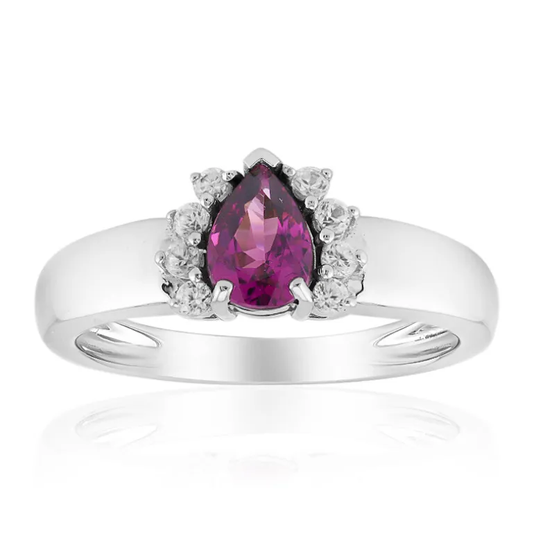 Entdecken Sie die Faszination dieses magentafarbenen Granatrings mit einem bezaubernden birnenförmigen Edelstein von 0,76 Karat aus Tansania. Umgeben von 8 funkelnden kambodschanischen Zirkonen, strahlt dieses Schmuckstück Eleganz aus. Gefertigt aus platiniertem 925er Sterlingsilber, ist es perfekt, um jeder Kleidung Raffinesse zu verleihen. Ideal für besondere Anlässe oder als stilvolles Accessoire für jeden Tag.