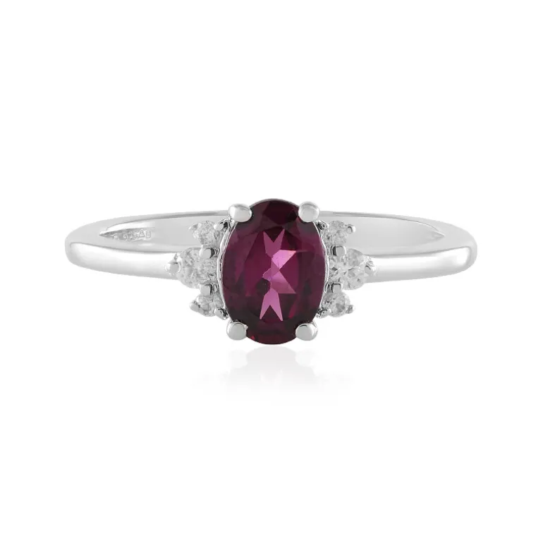 Entdecken Sie die exquisite Anziehungskraft eines magentafarbenen Granats in einer eleganten Fassung aus Sterlingsilber. Dieser Ring enthält einen Granat im Ovalschliff von 0,765 Karat aus Indien, der durch schimmernde Zirkonakzente aus Kambodscha ergänzt wird. Dieses Schmuckstück eignet sich perfekt, um sowohl im Alltag als auch bei besonderen Anlässen einen Hauch von Raffinesse zu vermitteln. Es passt hervorragend zu formeller Kleidung oder einem stilvollen Abendensemble. Ein Muss für Edelsteinliebhaberinnen.