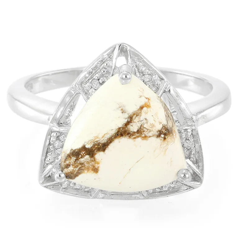 Entdecken Sie die Anziehungskraft dieses Rings aus brasilianischem Magnesit mit einem auffälligen 4,97-karätigen Trillant-Cabochon als Herzstück. Dieses exquisite Stück aus 925er Sterlingsilber ist mit sechs Brillanten besetzt. Sein einzigartiges Design passt sowohl zu formeller als auch zu legerer Kleidung und macht ihn zu einer vielseitigen Ergänzung Ihrer Schmucksammlung – perfekt für zwanglose Ausflüge und elegante Soirees.