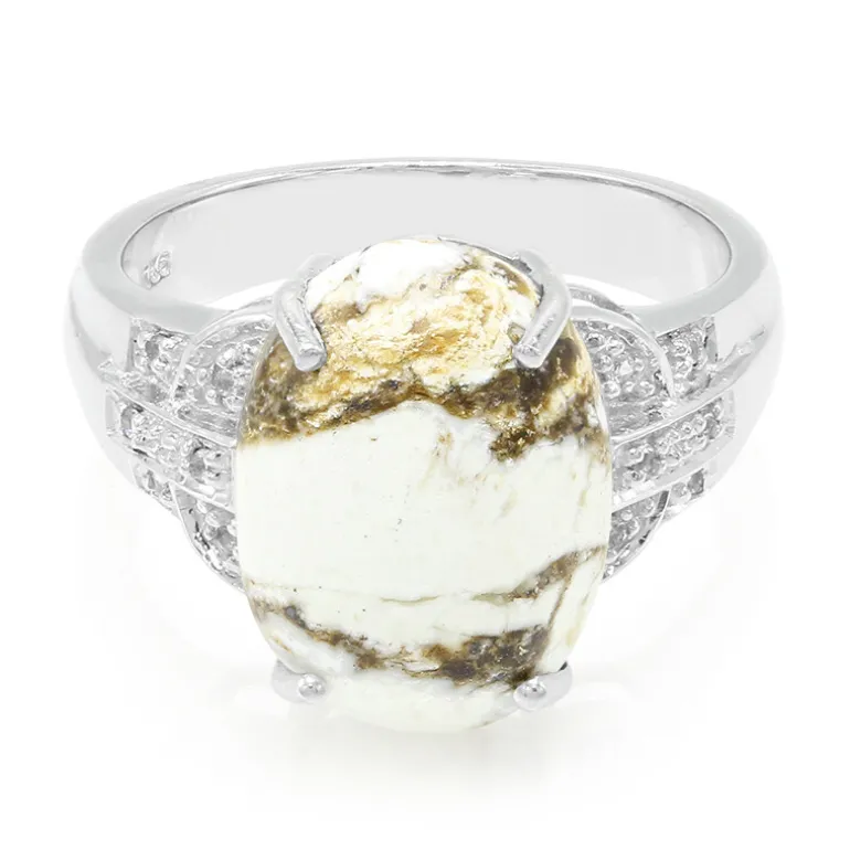 Entdecken Sie die Faszination dieses atemberaubenden Rings aus brasilianischem Magnesit mit einem großzügigen ovalen Cabochon von 4,5 Karat, der in glänzendem 925er Sterlingsilber gefasst ist. Verziert mit einer Reihe glitzernder weißer Topase von insgesamt 0,048 Karat, zeigt dieses Stück aufwändige Handwerkskunst und ein elegantes Design. Dieser Ring eignet sich perfekt, um sowohl tagsüber als auch abends einen Hauch von Raffinesse zu zeigen und ist eine vielseitige Ergänzung Ihrer Kollektion. Die einzigartige Farbpalette macht ihn zu einem auffälligen Gesprächsstarter bei jeder gesellschaftlichen Veranstaltung.