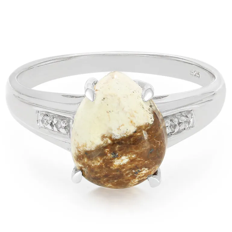Entdecken Sie Raffinesse mit diesem Magnesit-Sterlingsilberring. Mit einem 1,82 Karat schweren Magnesit-Cabochon aus Brasilien, der von vier weißen Topasen im Brillantschliff eingerahmt wird, bietet dieser Ring einen atemberaubenden Kontrast. Er eignet sich sowohl für legere als auch für elegante Anlässe und lässt sich wunderbar mit neutralen Tönen und klassischen Outfits kombinieren, um jedem Ensemble einen Hauch von Eleganz zu verleihen.