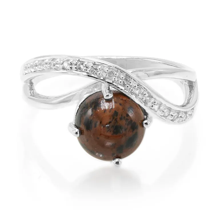 Dieser atemberaubende Ring präsentiert die satten, erdigen Töne des Mahagoni-Obsidians, der aus den USA stammt, in einer eleganten Fassung aus Sterlingsilber. Der runde Obsidian-Cabochon mit einem Gewicht von 1,32 Karat wird durch 16 funkelnde weiße Topase aus Brasilien ergänzt, die dem Schmuckstück einen kumulativen Glanz von 0,064 Karat verleihen. Dieser Ring ist ideal, um jedem Ensemble einen Hauch von Raffinesse zu verleihen und sorgt auf jeder Veranstaltung für Gesprächsstoff. Kombinieren Sie ihn sowohl mit Freizeitkleidung als auch mit formeller Kleidung, um seinen einzigartigen Charme zu unterstreichen.