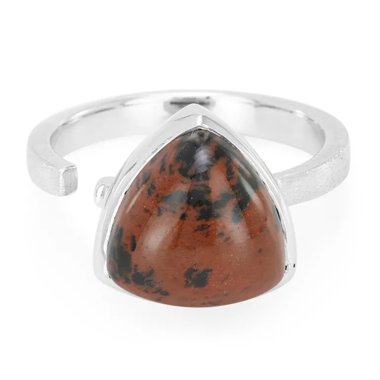Lassen Sie sich von der erdigen Eleganz dieses Mahagoni-Obsidian-Rings verzaubern. Der 5,42 ct große Edelstein im Trillantschliff aus den USA ist in hochwertigem 925er Sterlingsilber gefasst und zeigt satte Mahagonifarben mit natürlichen schwarzen Einschlüssen, die einen Hauch von Mysterium versprühen. Dank seines offenen Bandes passt sich der Ring verschiedenen Größen an und ist daher bequem zu tragen. Er eignet sich perfekt, um Ihrem Alltag einen Hauch von Raffinesse zu verleihen oder als Statement-Stück für besondere Anlässe.