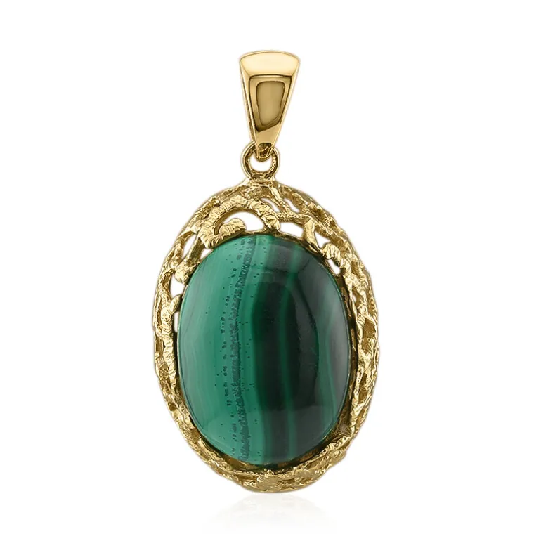 Erleben Sie die Faszination des Kongo mit diesem atemberaubenden Art of Nature-Anhänger mit einem ovalen Malachit-Cabochon von 15,51 Karat, eingefasst in 925er Sterlingsilber mit luxuriöser Goldplattierung. Die satten, gebänderten Grüntöne des Edelsteins werden in einem kunstvoll strukturierten Rahmen präsentiert, der an natürliche Formen erinnert. Dieser Anhänger eignet sich perfekt, um jedem Outfit einen Hauch von Raffinesse zu verleihen, und wird sowohl bei Tagesverpflichtungen als auch bei Abendveranstaltungen die Blicke auf sich ziehen.