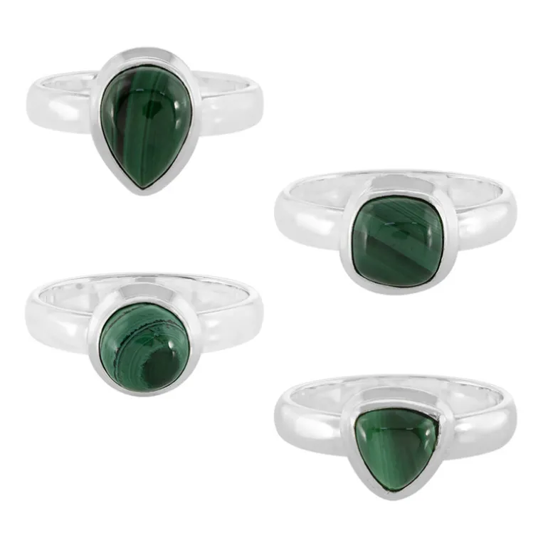 Entdecken Sie die üppige Tiefe des Kongo mit diesen Ringen aus Sterlingsilber, von denen jeder mit einem einzigartig geformten Malachit-Edelstein von insgesamt 7,221 ct besetzt ist. Vom glatten Regentropfen bis hin zu den antiken kissenförmigen, runden und trillantenförmigen Cabochons strahlen die Ringe zeitlosen Charme aus. Perfekt, um Ihrem Alltagslook oder besonderen Anlässen einen Hauch von Eleganz zu verleihen. Kombinieren Sie sie mit erdigen Tönen für ein harmonisches Ensemble oder kontrastieren Sie sie mit kräftigen Farben für einen auffälligen Effekt.