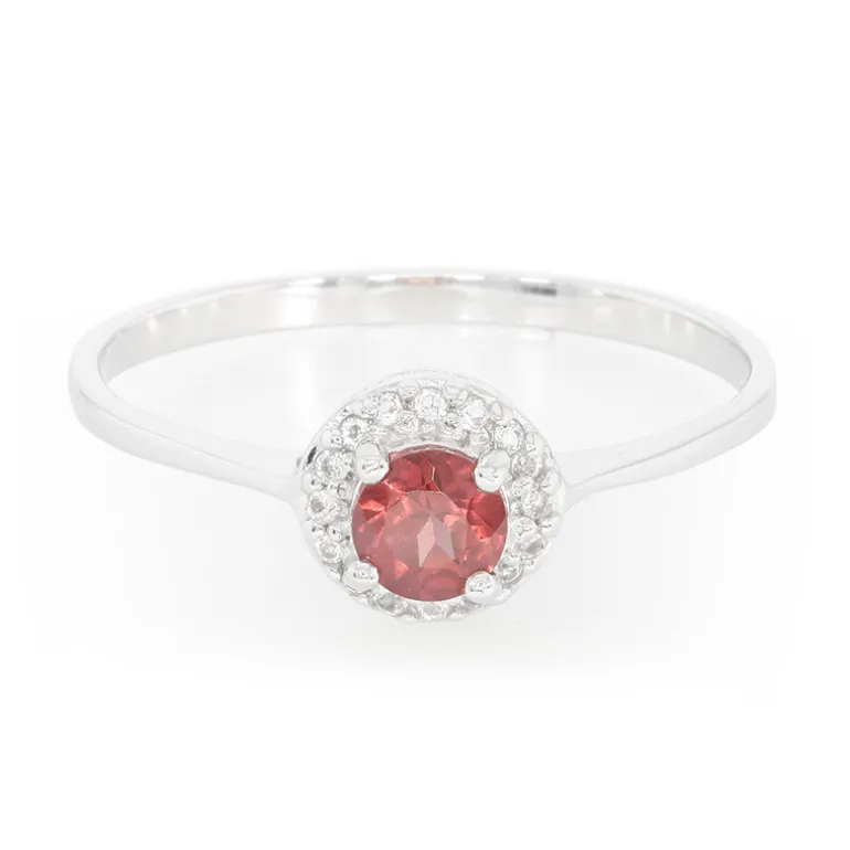Entdecken Sie die Anziehungskraft dieses exquisiten Rings mit Malaya-Granat, gefasst in poliertem 925er Sterling Silber. Der lebhafte 0,34-karätige Granat im Rundschliff aus Tansania wird von 16 funkelnden weißen Topasen aus Brasilien ergänzt. Dieser Ring eignet sich sowohl für den Tag als auch für den Abend und verleiht jedem Outfit einen Hauch von Eleganz. Eine ideale Wahl für besondere Anlässe oder als einzigartiges Geschenk.