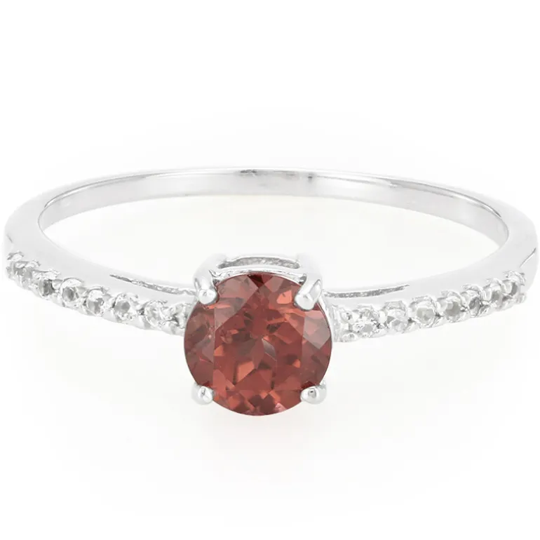Dieser elegante Ring ist mit einem tansanischen Malaya-Granat im Rundschliff besetzt, der für seine einzigartigen rosafarbenen Farbtöne geschätzt wird. Flankiert von einer Reihe glitzernder weißer Topase aus Brasilien mit einem Gesamtgewicht von 0,071 ct, ist das Design in poliertem 925er Sterlingsilber mit einem ungefähren Gewicht von 1,12 g gefasst. Das kombinierte Karatgewicht von 0,601 ct und die Größe von 23×19 mm machen dieses Stück zu einem unaufdringlichen und dennoch schicken Accessoire. Er passt perfekt zu einem Cocktailkleid oder setzt einen farblichen Akzent in der Alltagskleidung und ist eine vielseitige Ergänzung für jede Sammlung.