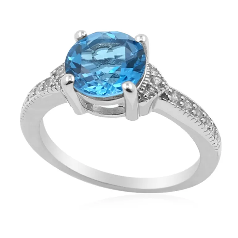 Entdecken Sie die Anziehungskraft dieses fesselnden brasilianischen Marambaia-Topas-Rings. Sein leuchtend blauer Rundschliff mit 1,872 Karat wird von 18 schimmernden Zirkonen aus Kambodscha mit insgesamt 0,213 Karat umrahmt. Der Ring ist aus glänzendem 925er Sterlingsilber gefertigt und hat ein Gesamtgewicht von 2,085 Karat. Sein Design ist perfekt, um sowohl am Tag als auch am Abend einen Hauch von Eleganz zu zeigen.