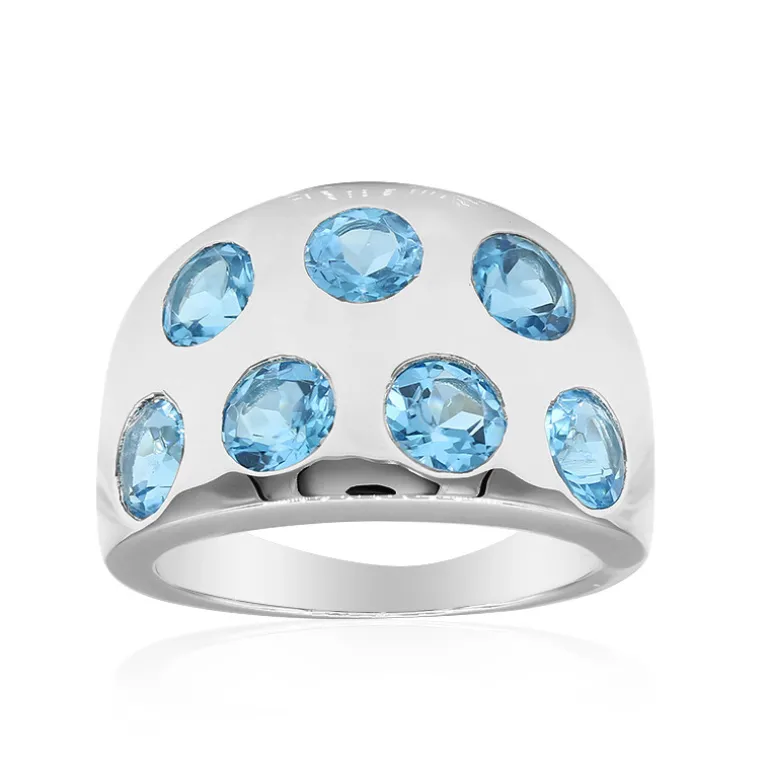 Entdecken Sie die lebendige Anziehungskraft dieses auffälligen Silberrings, der mit sieben brasilianischen Marambaia-Topasen bestückt ist. Jeder der sorgfältig auf 5 mm rund geschliffenen Edelsteine hat zusammen ein Gewicht von 3,654 Karat, gefasst vor dem glänzenden Hintergrund von 925er Sterlingsilber mit einem Gewicht von 8,78 g. Das Design hat eine auffällige Silhouette von 21 x 21 mm, die perfekt geeignet ist, um alltägliche Ensembles aufzuwerten oder besondere Anlässe mit einem Farbtupfer zu versehen. Dieser Ring wird in jeder Schmucksammlung zu einem beliebten Schmuckstück werden.