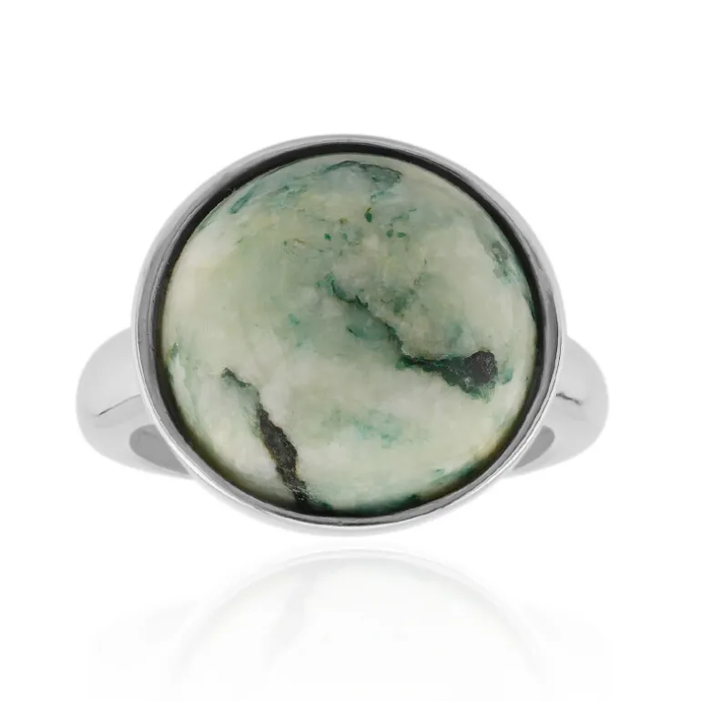 Entdecken Sie die Eleganz dieses maßgeschneiderten Rings, der einen 8,84-karätigen Mariposit mit seinen einzigartigen grünen Farbtönen und auffälligen Mustern präsentiert. Das Schmuckstück ist aus hochwertigem 925er Sterlingsilber gefertigt und mit einer luxuriösen Platinbeschichtung versehen, die ihm einen raffinierten Glanz verleiht. Der Ring ist ein künstlerisches Statement, das sowohl im Alltag als auch bei besonderen Anlässen einen Hauch von Raffinesse versprüht. Der runde Cabochon-Schliff unterstreicht nicht nur die Schönheit des Edelsteins, sondern verleiht Ihrem Look auch ein modernes Flair.