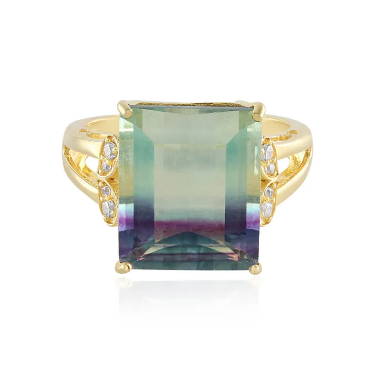 Entdecken Sie die fesselnde Anziehungskraft dieses vergoldeten Rings aus 925er Sterlingsilber, der einen faszinierenden 10,10-karätigen, mehrfarbigen Fluorit aus Brasilien mit auffälligem Achteckschliff enthält. Der zentrale Edelstein ist in einer glänzenden Fassung gefasst und wird von acht funkelnden Zirkonen aus Kambodscha akzentuiert, die ihm einen Hauch von Brillanz verleihen. Dieser Ring ist ideal, um jedem Ensemble einen Hauch von Eleganz zu verleihen. Er eignet sich perfekt für besondere Anlässe oder als Statement-Stück in einer raffinierten Schmucksammlung.