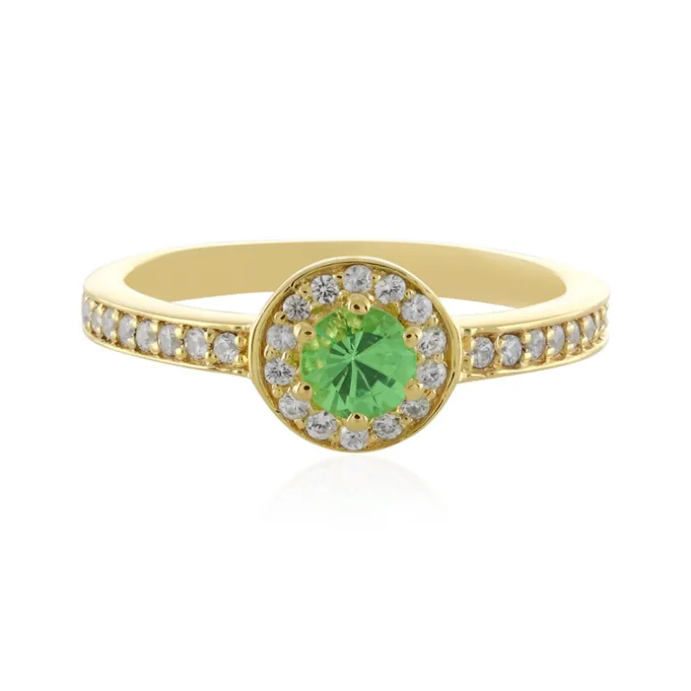 Entdecken Sie die Anziehungskraft unseres atemberaubenden Rings mit einem strahlenden Merelani-Granat aus Tansania, der von funkelnden Zirkonen aus Kambodscha umgeben ist. Der Ring ist aus vergoldetem 925er Sterlingsilber gefertigt und glänzt mit einem Gesamtgewicht von 0,527 ct. Dieser Ring ist ideal, um sowohl legere als auch formelle Outfits mit einem Farbtupfer zu versehen. Er verkörpert Raffinesse und wird mit Sicherheit Komplimente ernten. Er ist ein zeitloses Geschenk oder eine persönliche Kostbarkeit und verkörpert mit seinem lebhaften Grünton und dem klassischen Design das Wesen der Eleganz.