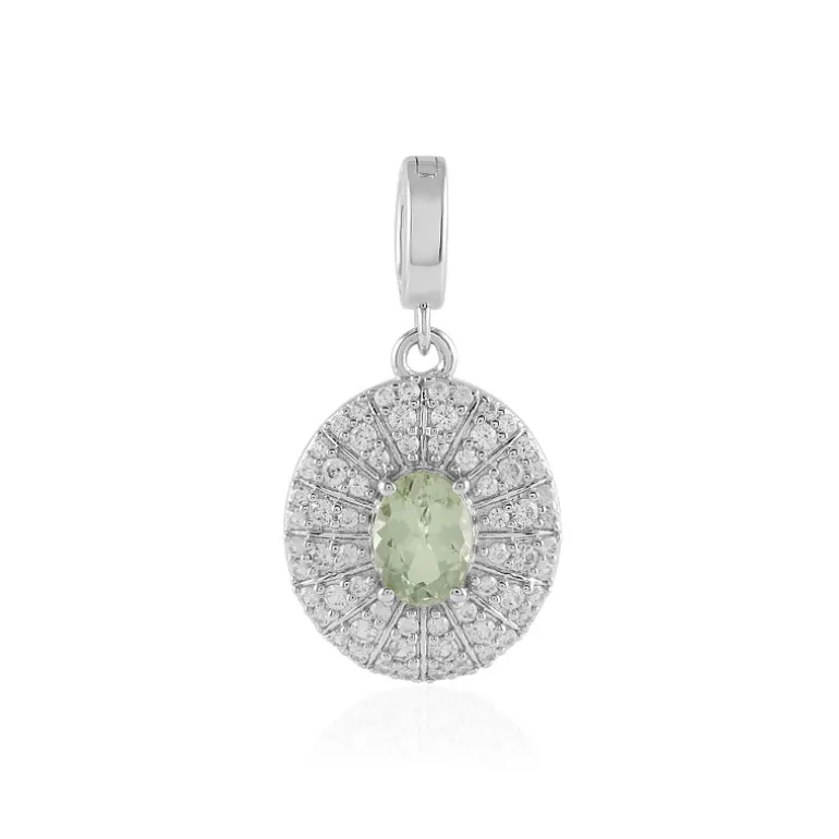 Entdecken Sie die Anziehungskraft dieses strahlenden Merelani Mint Granats im Ovalschliff, der inmitten eines schimmernden Halos aus kambodschanischen Zirkonen liegt. Der aus platiniertem 925er Sterling Silber gefertigte Anhänger hat ein Gesamtgewicht von 1,333 ct. Das Herzstück aus Tansania schmückt mit seinem pastellgrünen Farbton jedes Outfit. Das Varioclip-Design sorgt für Vielseitigkeit bei verschiedenen Ketten und verleiht sowohl im Alltag als auch bei besonderen Anlässen einen Hauch von Eleganz.