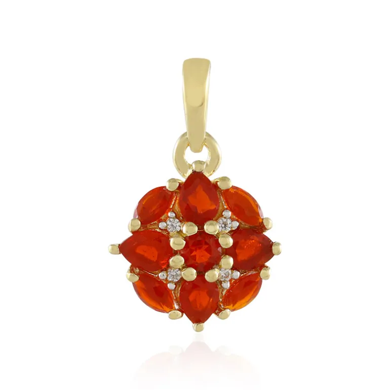 Entdecken Sie den strahlenden Charme der mexikanischen Feueropale in diesem atemberaubenden vergoldeten Silberanhänger. Die feurigen Edelsteine im Birnen-, Marquise- und Rundschliff werden von kambodschanischen Zirkonen akzentuiert. Das lebendige Design macht ihn zu einem perfekten Accessoire für die Abendgarderobe oder elegante Veranstaltungen. Kombinieren Sie ihn mit einem schlichten Dekolleté, um den Anhänger zum Mittelpunkt Ihres Outfits werden zu lassen.
