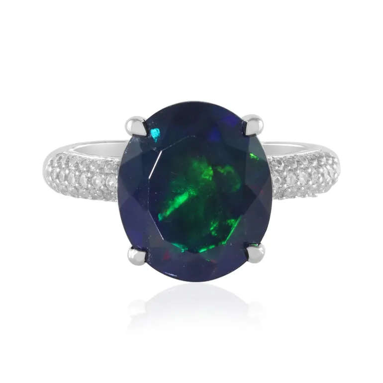 Entdecken Sie zeitlose Eleganz mit diesem atemberaubenden Mezezo-Opal-Ring. Er enthält einen äthiopischen Mezezo-Opal von 3,692 ct im Ovalschliff, begleitet von 44 kambodschanischen Zirkonen von insgesamt 0,523 ct. Das Band aus 925er Sterlingsilber ist platiniert und bietet ein raffiniertes Finish. Dieses Schmuckstück eignet sich sowohl für legere als auch für formelle Anlässe und lässt sich wunderbar mit Abendgarderobe kombinieren oder verleiht Ihrer Alltagskleidung einen Hauch von Glanz.
