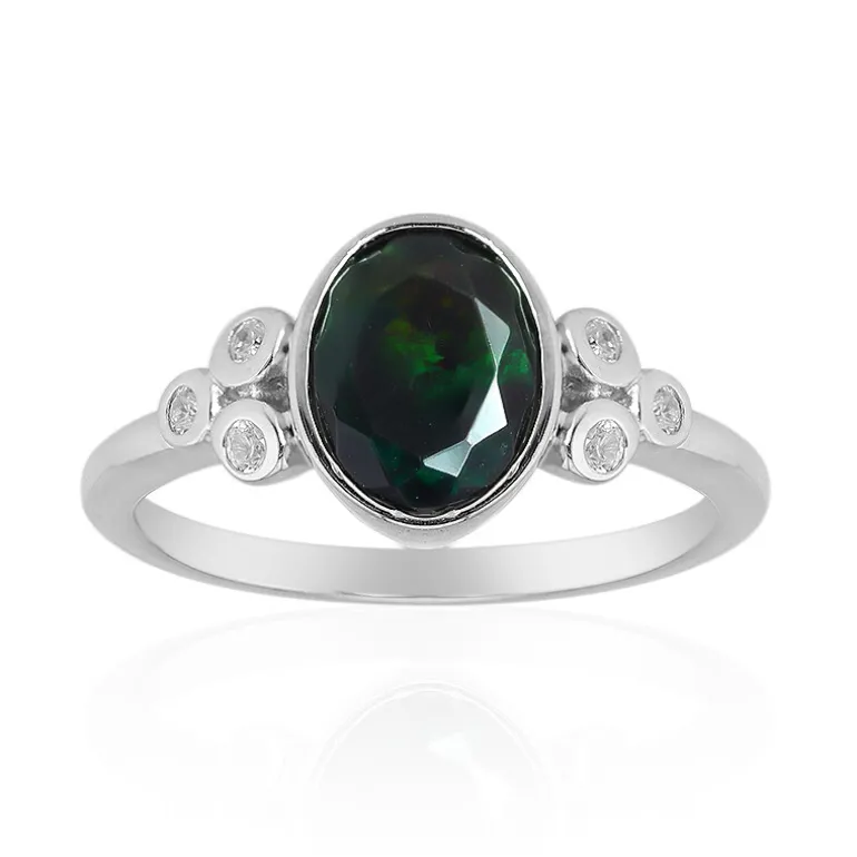 Entdecken Sie die bezaubernde Schönheit dieses Mezezo-Opalrings mit einem fesselnden ovalen Opal aus Äthiopien von 0,777 ct. Umgeben von sechs funkelnden Zirkonsteinen aus Kambodscha, strahlt dieses Schmuckstück Eleganz aus. Das platinierte 925er Sterlingsilber sorgt für ein edles Finish. Er eignet sich sowohl für den Alltag als auch für besondere Anlässe und kann mit einem eleganten Abendkleid oder einem schicken Freizeitoutfit kombiniert werden, um einen Hauch von Luxus zu vermitteln.