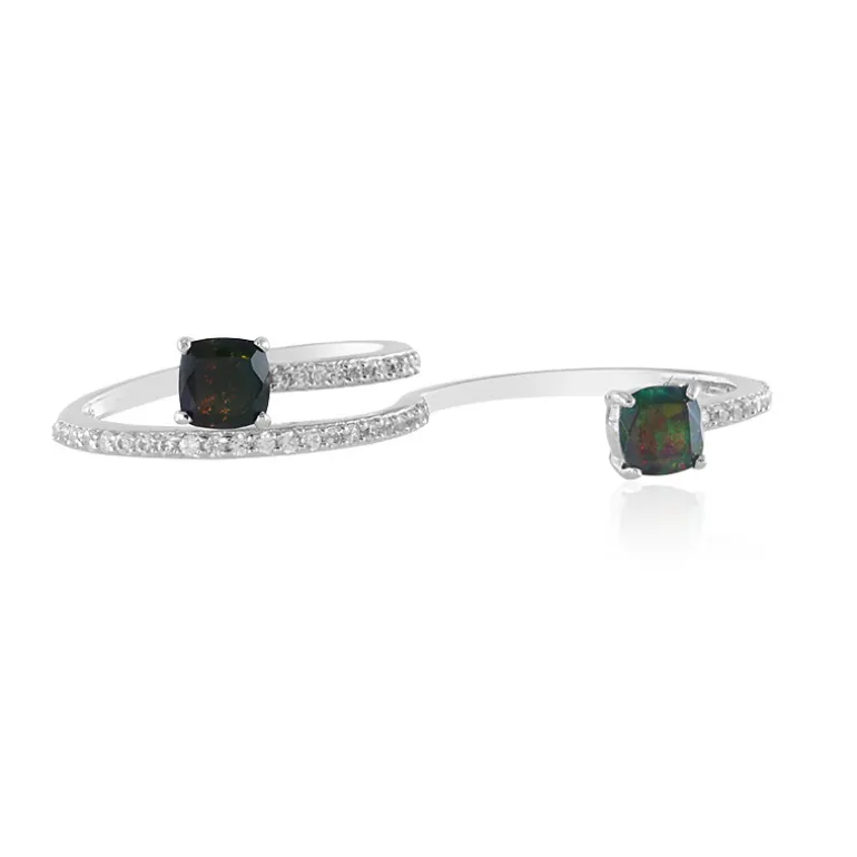 Entdecken Sie die fesselnde Anziehungskraft dieses Rings aus 925er Sterlingsilber, der zwei bezaubernde Mezezo-Opale aus Äthiopien mit einem Gesamtgewicht von 0,607 ct im historischen Kissenschliff enthält. Eine Kaskade von 45 schimmernden Zirkonen aus Kambodscha mit einem Gesamtgewicht von 0,557 ct unterstreicht die Eleganz des Rings und verleiht Ihrer Hand einen Hauch von Raffinesse. Dieser Ring ist ideal für das tägliche Tragen oder für besondere Anlässe. Er lässt sich sowohl mit legeren als auch mit formellen Outfits kombinieren und verspricht, ein geschätztes Stück in Ihrer Schmucksammlung zu werden.