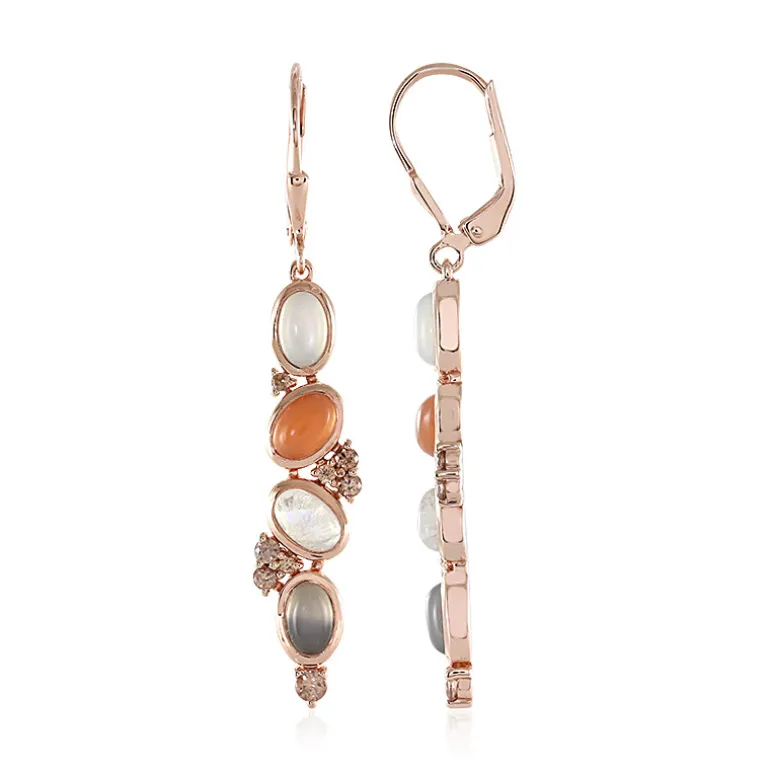 Entdecken Sie die Eleganz dieser rosé-vermoldeten Silberohrringe mit einer Symphonie von Mondsteinen aus Indien: weiß, regenbogenfarben, pfirsichfarben und silberfarben. Die funkelnden champagnerfarbenen Zirkone aus Kambodscha verleihen ihnen eine bezaubernde Ausstrahlung. Diese Ohrringe sind perfekt, um die Abendgarderobe aufzuwerten oder einem legeren Ensemble einen Hauch von Raffinesse zu verleihen. Sie verkörpern sowohl Charme als auch Klasse.