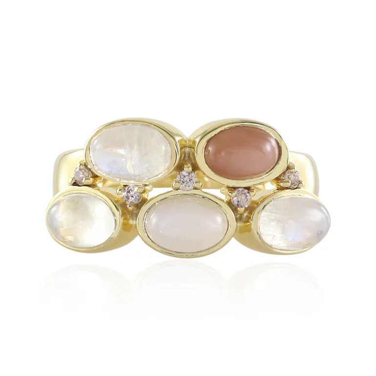 Dieser opulente Ring von KM besteht aus einem Mosaik aus indischen Mondsteinen, die das Spektrum von Regenbogen- bis Schokoladentönen erhellen. Eingebettet in 925er Sterlingsilber, das mit glänzendem Gold vergoldet ist, wiegen diese Steine zusammen 2,34 Karat. Akzente aus champagnerfarbenen Zirkonen aus Kambodscha vervollständigen das Design und verleihen ihm einen Hauch von zeitloser Eleganz. Dieses einzigartige Schmuckstück eignet sich perfekt, um sowohl der Tages- als auch der Abendgarderobe einen Hauch von Eleganz zu verleihen und sorgt auf jeder Veranstaltung für Gesprächsstoff.